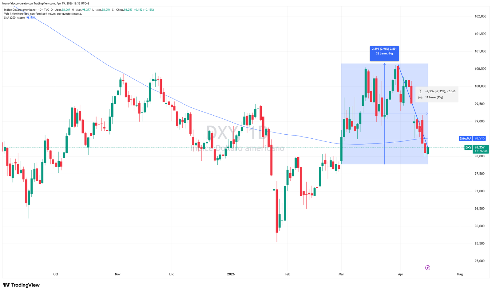 Il miglioramento del sentiment e il ritorno al rischio è evidente anche nel dollaro (DXY), asset rifugio che ha performato come da manuale a inizio conflitto e che ora ha perso quasi tutto il guadagno accumulato durante la fase più acuta della crisi (-2,5%), segnando il ritorno sotto la media a 200 periodi.