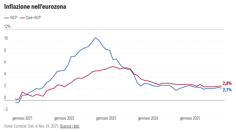 L’inflazione dell’eurozona infatti, scesa al 2,1% a ottobre, si mantiene vicina all’obiettivo target del 2% e i mercati non prevedono ulteriori riduzioni prima del 2026. Il contesto rimane tuttavia complesso per l’area: crescita debole, trasmissione lenta della politica monetaria e incertezze legate alle nuove proiezioni macro di dicembre.