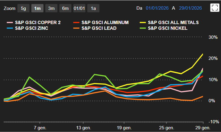 In questo momento sta sostenendo il forte rialzo dei metalli preziosi, con oro e argento in testa e ancora in accelerazione. A questi si affiancano anche i metalli industriali che iniziano a mostrare segnali di surriscaldamento, tutti con aumenti a doppia cifra da inizio anno.