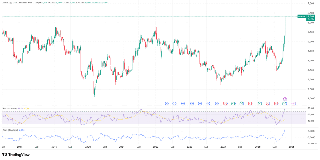 La notizia del giorno arriva da Nokia: il colosso finlandese, un tempo simbolo della telefonia mobile, è balzato del 21% dopo che Nvidia ha annunciato una partecipazione del 2,9% nel capitale. L’investimento è simbolico, ma il segnale è forte: la corsa all’infrastruttura digitale (reti, data center e componentistica) è ormai parte integrante del nuovo ciclo tecnologico legato all’intelligenza artificiale.