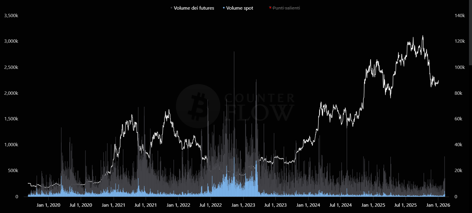 Il mercato dei derivati crea un’offerta “sintetica” che diluisce l’effetto della scarsità tipica di Bitcoin ed è, per volumi scambiati e a seconda delle giornate di negoziazione, dalle 3 alle 10 volte più grande rispetto a al mercato spot.