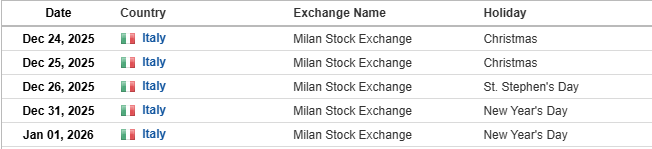 Nel complesso, i mercati sembrano prepararsi a un finale d’anno stagionalmente positivo, con volumi sottili e poche sedute rimaste. Di seguito il calendario delle festività natalizie, più fitto per la borsa italiana rispetto a quella americana.