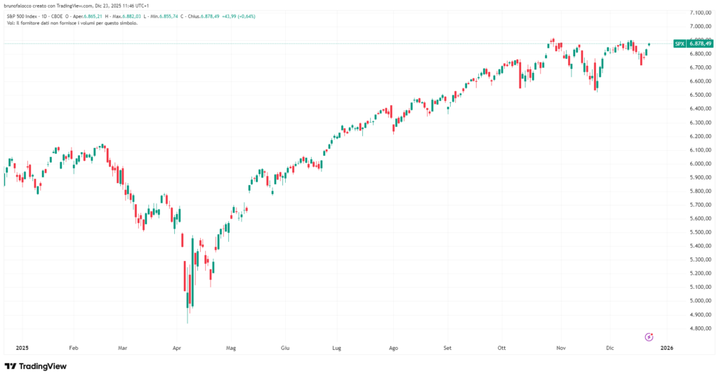 Le azioni statunitensi hanno inanellato tre sedute positive consecutive, riportando l’S&P 500 (SPX) di nuovo in prossimità dei massimi storici, mentre Nasdaq 100 e small cap restano più indietro. Il movimento delle ultime giornate riflette un clima di attesa più che di vero entusiasmo natalizio, con gli operatori concentrati sugli ultimi dati macro del 2025 (PIL USA e ordini di beni durevoli) per capire se possono spostare in qualche modo le aspettative sui tagli dei tassi della Fed.