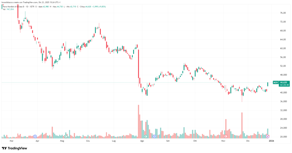 L’azienda danese, tra le più grandi public company europee, potrà lanciarlo negli USA a gennaio 2026 a prezzo aggressivo ($149/mese cash-pay, potenzialmente $25/mese con assicurazione), guadagnando un vantaggio temporaneo su Eli Lilly (NYSE:LLY), la cui alternativa Orforglipron dovrebbe arrivare solo tra marzo e estate 2026. Dopo un periodo difficile certificato dal crollo del ~50% da inizio anno, questa approvazione è stata accolta positivamente dal mercato e questo breve vantaggio sulla diretta concorrente potrebbe segnare un turning point per il rilancio del titolo.