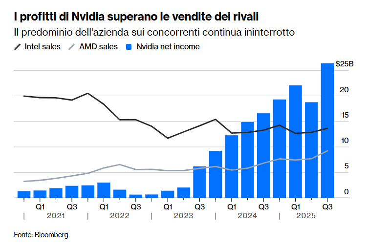 I conti record del colosso AI evitano una correzione dei mercati, ma la Fed frena l’entusiasmo: cala la probabilità di un taglio a dicembre.