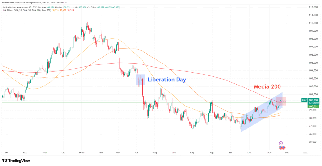 La revisione delle probabilità di un taglio dei tassi ha spinto il DXY, l’indice che misura la forza del dollaro rispetto a un paniere valute principali, a superare quota 100 punti, livello tenuto saldamente fino al Liberation Day. Significativa in aggiunta è che l’indice abbia chiuso sopra la media mobile a 200 periodi, un segnale tecnico di rilievo, che potrebbe preludere a una fase di rafforzamento strutturale del dollaro, o quasi. Vediamo perché.