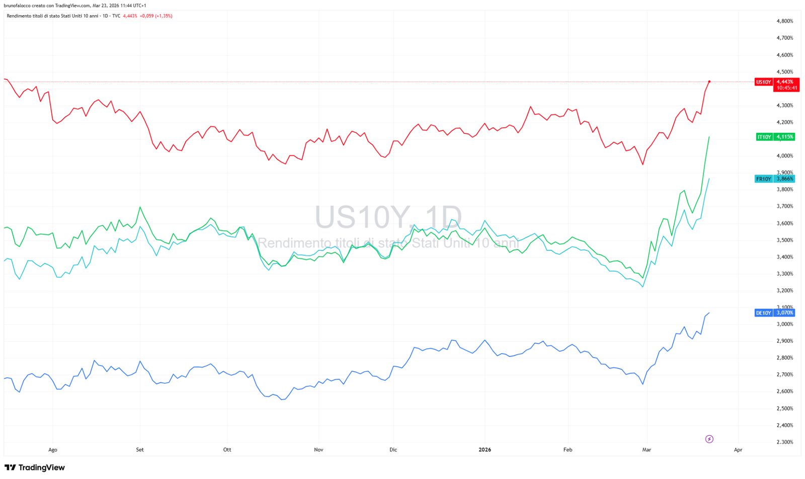 Questo ha avuto un impatto diretto sui rendimenti obbligazionari, in forte rialzo su tutte le principali scadenze come conseguenza della possibilità di rialzo nei tassi nei prossimi mesi. Di seguito una comparativa sul decennale USA vs. Germania vs. Francia vs. Italia.