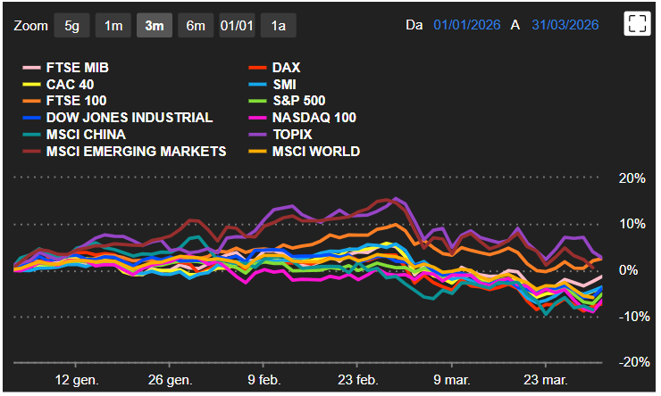 Lo shock energetico e i crescenti dubbi sulla profittabilità dell’AI hanno segnato un primo trimestre complesso per gli investitori. I mercati chiudono in territorio negativo su tutti i principali indici azionari, ad esclusione di pochi.