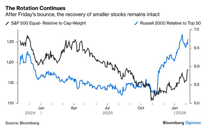 Come evidenziato dagli analisti di Bloomberg, l’S&P 500 a peso uguale (dove ogni titolo conta allo stesso modo) sta battendo l’indice dominato dalle mega-cap (dove le big tech pesano di più), mentre le small cap rappresentate dal Russell 2000 superano le grandi capitalizzazioni con una forza che non si vedeva da quando i rialzi dei tassi del 2022 avevano frenato il trend delle growth stock rispetto alle aziende value.