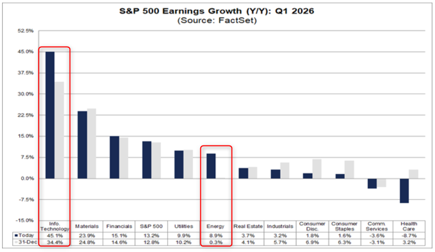 Questo disallineamento tra fondamentali macro (negativi) e aspettative sugli utili (positive) potrebbe configurare un potenziale controsenso se non si analizzano le aziende traino di questa crescita attesa per il primo trimestre dell’anno, ovvero energia (nessuna sorpresa!) e settore IT con il trend AI/data center. Grazie alla domanda esplosiva di chip, server e infrastrutture, queste aziende stanno registrando una crescita dei ricavi e dei margini talmente forte da compensare (e in alcuni casi superare) la pressione sui costi energetici che invece colpisce i settori più tradizionali.