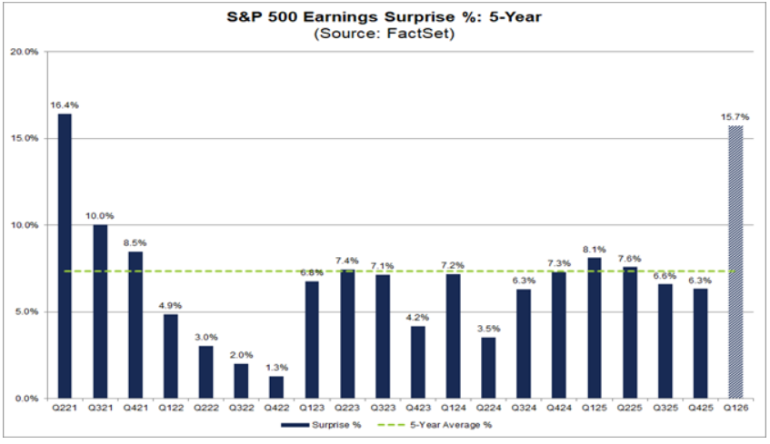 Secondo FactSet, la crescita degli utili dell’S&P 500 per il Q1/2026 è attualmente stimata al 13,2%. Tuttavia, come accade ormai da anni, le società tendono a superare le aspettative degli analisti durante la stagione dei risultati trimestrali.