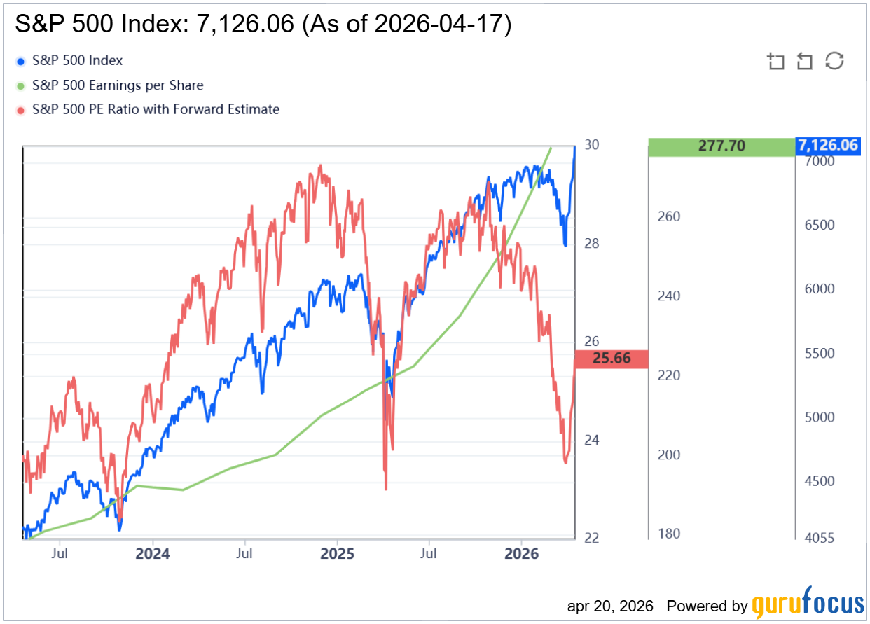 Guardando all’S&P 500, si nota infatti come il rapporto P/E forward (linea rossa) abbia iniziato a calare da circa sei mesi. Non per una compressione dei prezzi delle azioni, bensì per l’aumento del denominatore, ovvero grazie alla crescita continua degli utili (linea verde).