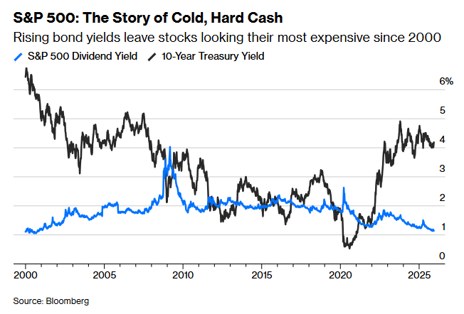 In questo contesto, pagare di più per l’asset azionario ha senso solo se è in grado di garantire rendimenti più alti e duraturi rispetto ad altre alternative come quella del mercato obbligazionario, ma così non è!