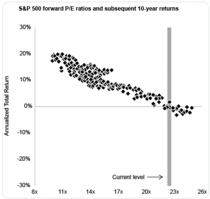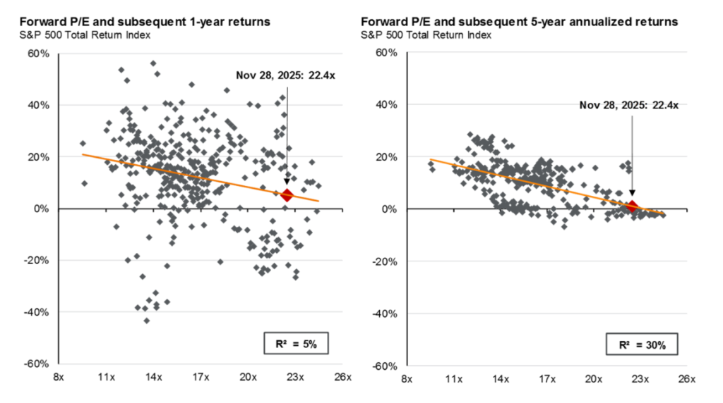 La relazione storica che lega infatti i multipli come il P/E e i rendimenti è chiara: a valutazioni elevate corrispondono rendimenti storici più contenuti. Vediamo a tal proposito cosa dicono i grafici di J.P. Morgan che mettono in relazione i Forward P/E dell’S&P 500 con i rendimenti su orizzonti a 1 e 5 anni: